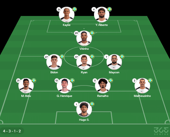 Provável escalação do Corinthians: Hugo Souza; Matheuzinho, André Ramalho, G. Henrique, M. Bidu; Maycon, Ryan, Bidon; Vitinho, Yuri Alberto, Kayke. Técnico: Dorival Júnior