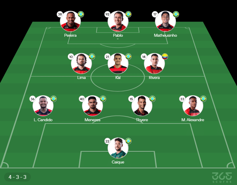 - Provável escalação do Sport: Caique; Matheus Alexandre; Rafael Thyere, Ramon Menezes e Luan Cândido; Rivera, Lucas Kal e Lucas Lima; Matheusinho, Pablo e Léo Pereira