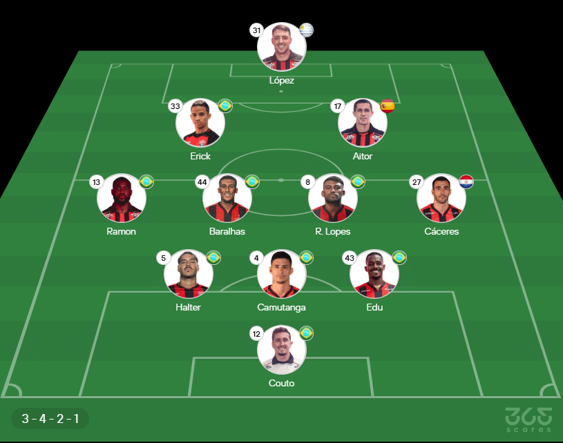 - Provável escalação do Vitória: Thiago Couto; Edu, Camutanga e Lucas Halter; Cáceres, Ronald Lopes, Baralhas e Ramon; Aitor e Erick; Renzo López