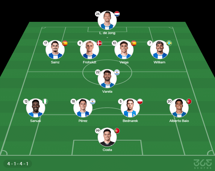- Provável escalação do Porto: Diogo Costa, Sanusi, Pérez, Bednarek e Alberto Baio; Varela, Sainz, Froholdt, Veiga e William; Luuk de Jong