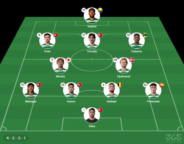Provável escalação do Sporting: Rui Silva, Mangas, Gonçalo Inacio, Debast e Fresneda; Morita, Hjulmand, Pote, Trincão e Catamo; Luis Suárez. Técnico: Rui Borges.