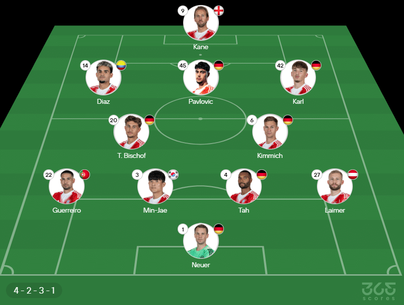 Provável escalação do Bayern de Munique: Neuer; Laimer, Jonathan Tah; Kim Min-jae e Raphael Guerreiro; Kimmich e Bischof; Karl, Pavlovic e Luis Díaz; Harry Kane. Técnico: Vincent Kompany.