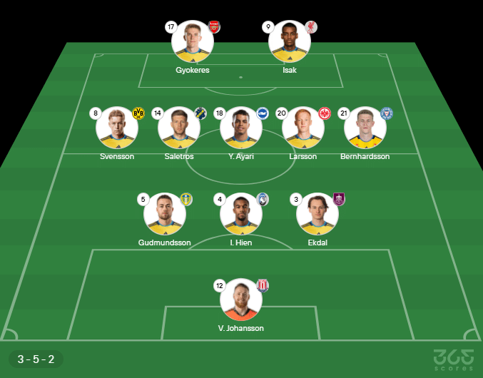 Em comparação com o último jogo – derrota por 2 a 0 para Kosovo -, a equipe deverá ter duas mudanças. No gol, Johansson assume a vaga de Olsen, que não foi convocado. Já na frente, Elanga dará lugar a Isak.
