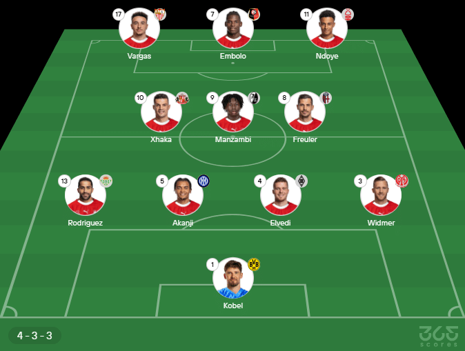 - Provável escalação da Suíça: Kobel; Rodriguez, Akanji, Elvedi e Widmer; Xhaka, Manzambi e Freuler; Vargas, Embolo e Ndoye