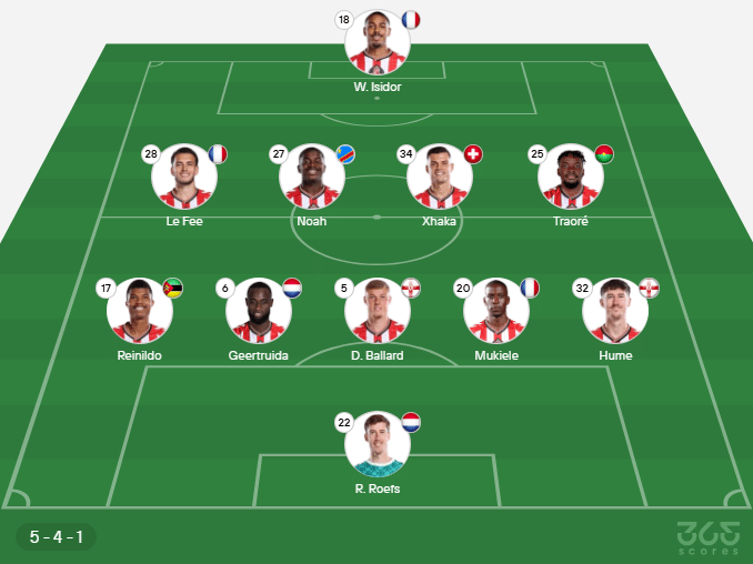 - Escalação do Sunderland: Roefs, Hume, Mukiele, Ballard, Geertruida, Reinildo; Xhaka, Noah, Traoré, Le Fee; Isidor