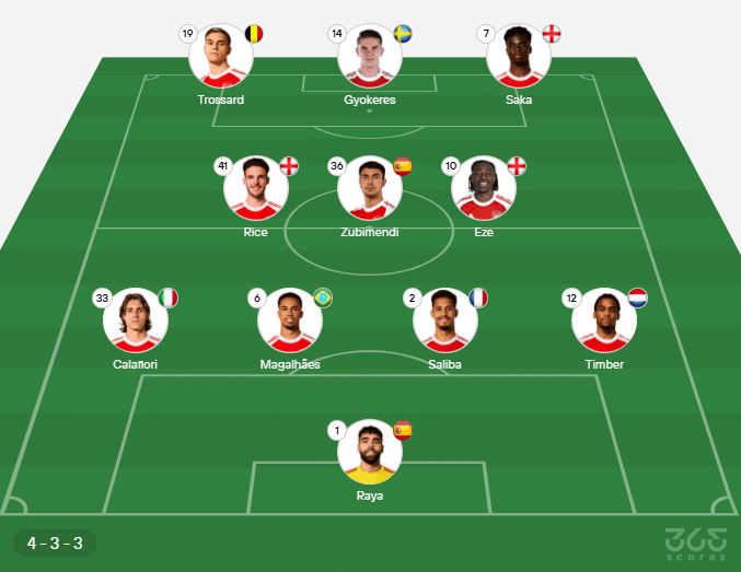 - Escalação do Arsenal: Raya, Timber, Saliba, Gabriel Magalhães, Calafiori; Zubimendi, Eze, Rice; Saka, Trossard, Gyokeres