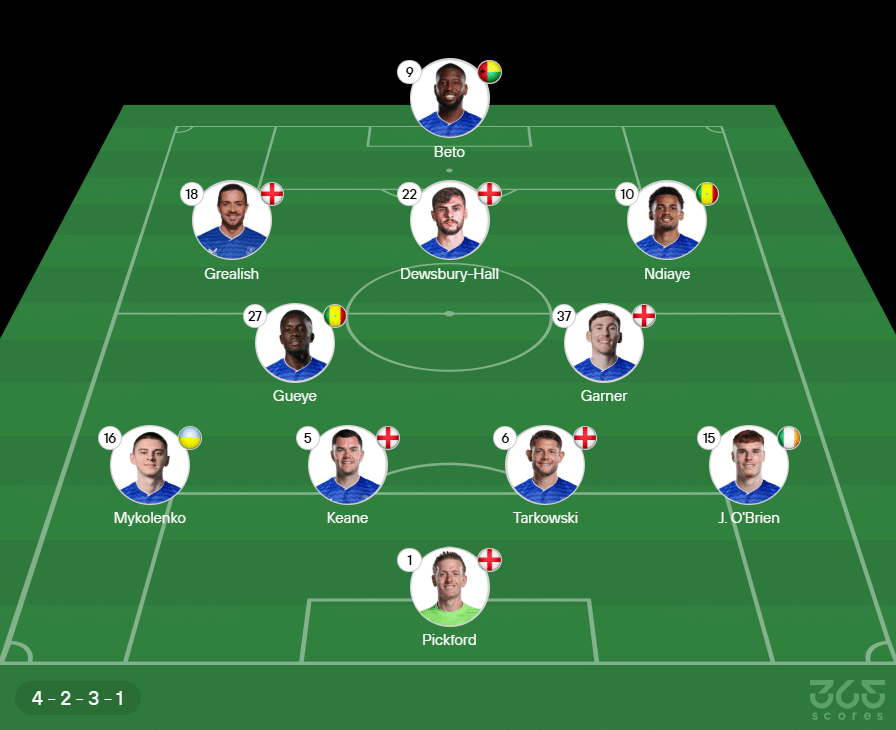 Escalação do Everton: Pickford, O’Brien, Tarkowski, Kene e Mykolenko; Garner, Gueye, Ndiaye, Dewsbury-Hall e Grealish; Beto. Técnico: David Moyes.