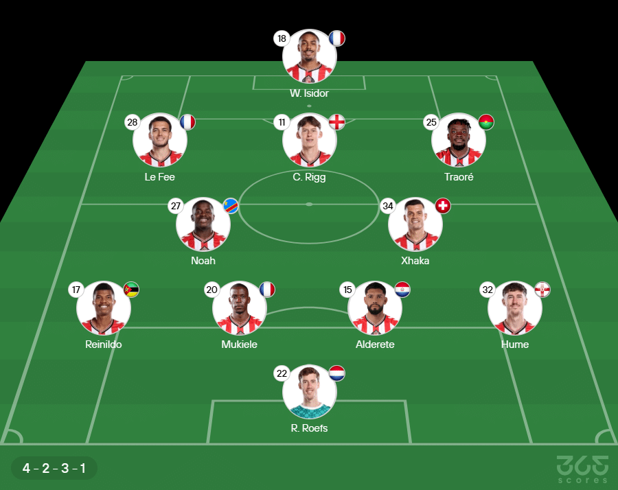 - Escalação do Sunderland: Roefs, Hume, Alderete, Mukiele e Reinildo; Xhaka, Noah, Traoré, Rigg e Le Fee; Isidor