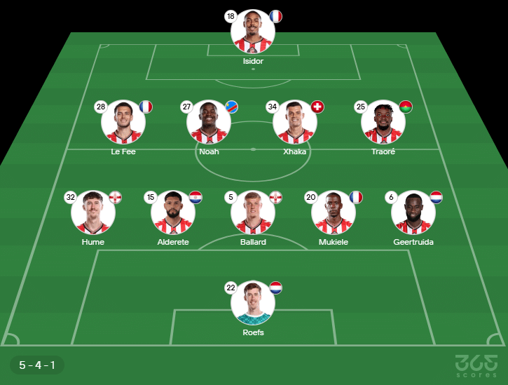 Provável escalação do Sunderland: Roefs; Geertruida, Mukiele, Ballard, Alderete, Hume; Traoré, Xhaka, Noah, Le Fee; Isidor. Técnico: Régis Le Bris