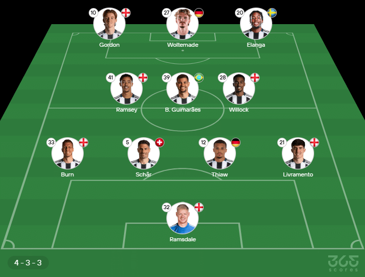 Provável escalação do Newcastle: Ramsdale; Livramento, Thiaw, Schär, Burn; Bruno Guimarães, Willock, Ramsey; Elanga, Gordon, Woltemade. Técnico: Eddie Howe
