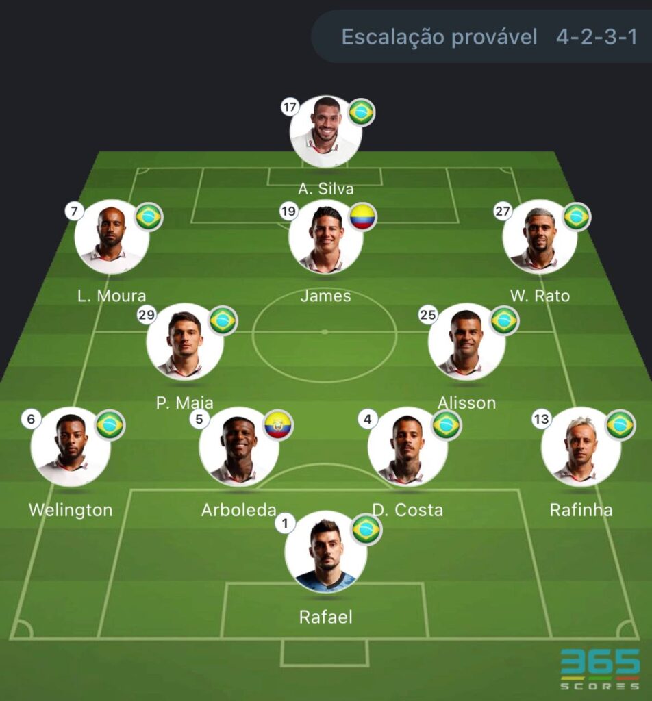 Provável escalação do São Paulo: Rafael, Rafinha, Arboleda, Diego Costa, Welington; Pablo Maia, Alisson, James Rodríguez, Lucas, Wellington Rato, André Silva.