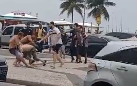 Nas imagens, quatro indivíduos agridem um homem, o jogam no chão e arrancam bruscamente sua camisa. Posteriormente, ele consegue se desvencilhar e é retirado do local por outra pessoa.