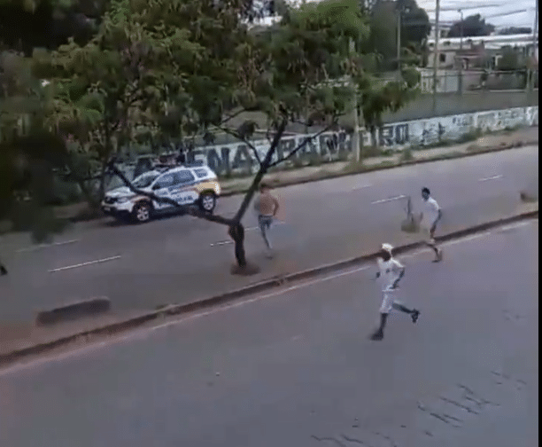 É possível notar também que a polícia chegou para tentar acalmar os ânimos e encerrar a confusão. Os vídeos foram gravados por moradores da região que flagraram a situação.