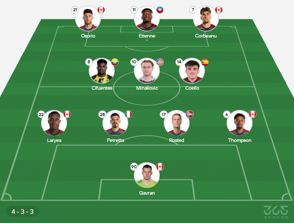 - Provável escalação do Toronto FC: Gavran, Thompson, Rosted, Petretta, Laryea; Coello, Mihailovic, Cifuentes; Corbeanu, Osorio, Etienne