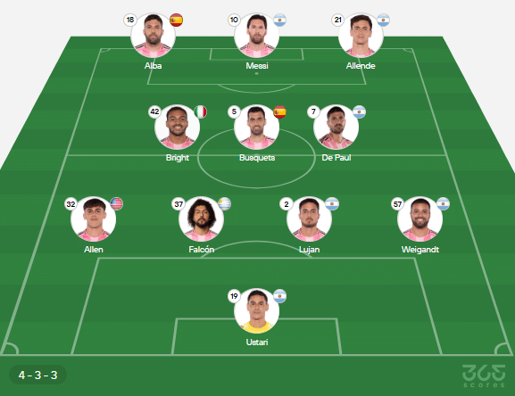 - Provável escalação do Inter Miami: Ustari, Wigandt, Lujan, Falcón, Allen; Busquets, De Paul, Bright; Allende, Alba, Messi