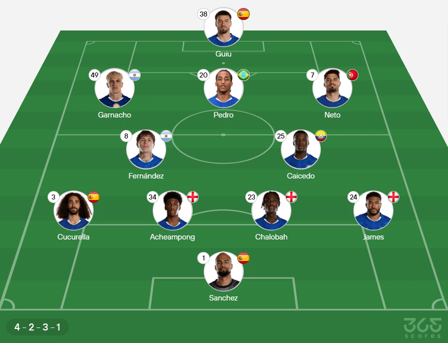 Provável escalação do Chelsea: Sanchez; Rice James, Chalobah, Acheampong e Cucurella; Caicedo e Enzo Fernández; Garnacho, Pedro Neto e João Pedro; Marc Guiu.