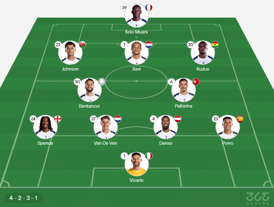 - Provável escalação do Tottenham: Vicario; Pedro Porro, Kevin Danso, Van De Ven e Djed Spence; João Palhinha e Bentancur; Brennan Johnson, Xavi Simons e Mohammed Kudus; Kolo Muani.