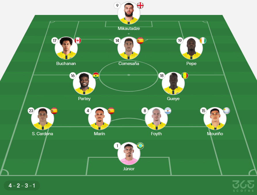 Provável escalação do Villarreal: Luiz Júnior; Mouriño, Foyth, Marín e Sergi Cardona; Gueye e Thomas Partey; Comesaña, Pepe e Buchanan; Mikautadze.