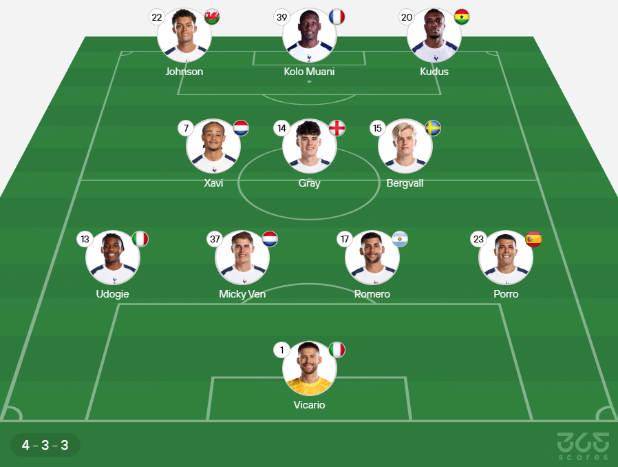 - Provável escalação do Tottenham: Vicario; Pedro Porro, Romero, Van de Ven e Udogie; Archie Grey (Sarr), Bergvall e Xavi Simons; Kudus, Brennan Johnson e Kolo Muani.