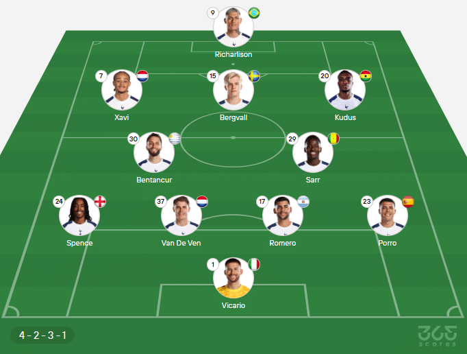 - Provável escalação do Tottenham: Vicario, Porro, Romero, Van de Ven, Spence; Sarr, Bentancur, Kudus, Xavi Simons, Bergvall; Richarlison