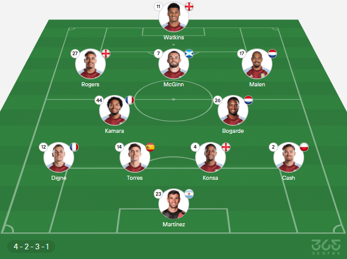 - Provável escalação do Aston Villa: Martínez, Cash, Konsa, Torres, Digne; Bogarde, Kamara, Malen, Rogers, McGinn; Watkins