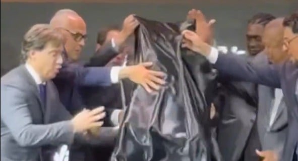 Os ex-atletas como Seedorf, Romário e Alessandro Nesta, entre outros, puxaram um pano e por pouco não derrubaram a caixa que guardava o troféu. Veja o vídeo do momento:
