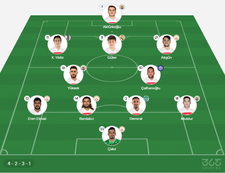 - Provável escalação da Turquia: Çakir, Muldur, Demiral, Bardakci, Elmali; Çalhanoglu, Yüksek, Akgün, Güler, Yildiz; Aktürkoglu