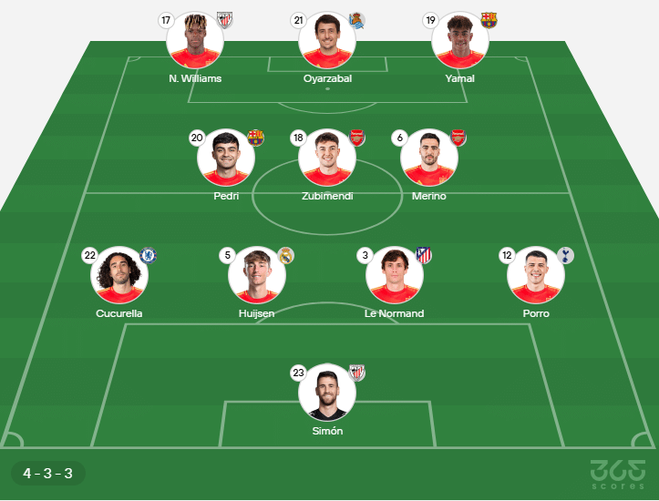 Provável escalação da Espanha: Simón, Porro, Le Normand, Huijsen, Cucurella; Zubimendi, Merino, Pedri; Yamal, Williams, Oyarzabal. Técnico: Luis de la Fuente