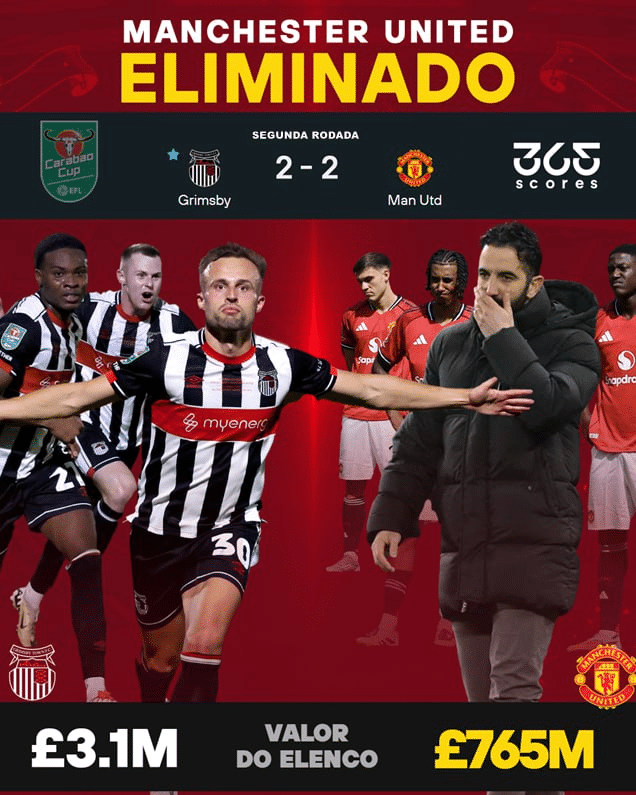 Com isso, o United do técnico Rúben Amorim caiu na Carabao Cup na segunda rodada e colecionou o primeiro vexame da temporada. Bryan Mbeumo e Harry Maguire marcaram para o Manchester, enquanto Charles Vernam e Tyrell Warren fizeram para o Grimsby.