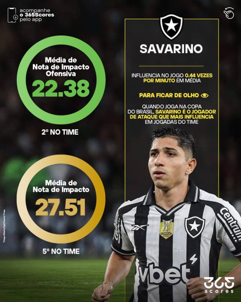 Savarino, por outro lado, tem na Copa do Brasil uma Nota de Impacto ofensiva de 22.38, influenciando no jogo 0.44 vezes por minuto em média.