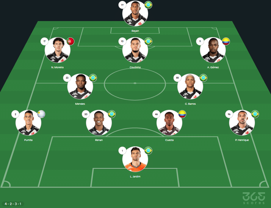 Provável escalação do Vasco: Léo Jardim; Paulo Henrique, Cuesta, Robert Renan e Pumita Rodríguez; Cauã Barros e Thiago Mendes; Andrés Gómez, Coutinho e Nuno Moreira; Rayan. Técnico: Fernando Diniz.