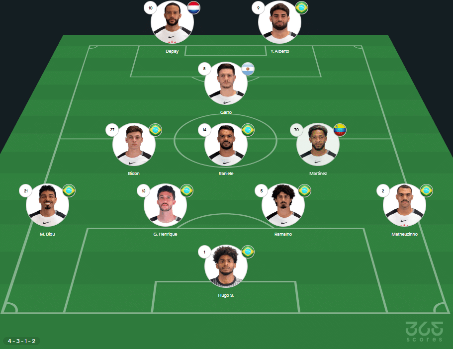 Provável escalação do Corinthians: Hugo Souza; Matheuzinho, André Ramalho, Gustavo Henrique e Matheus Bidu; Martínez, Raniel, Breno Bidon e Garro; Yuri Alberto e Memphis. Técnico: Dorival Júnior.
