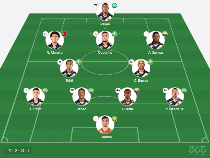 - Provável escalação do Vasco: Léo Jardim, Paulo Henrique, Cuesta, Robert Renan, Lucas Piton; Cauan Barros, Tchê Tchê, Gómez, Nuno Moreira, Coutinho; Rayan