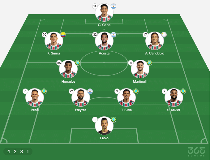 - Provável escalação do Fluminense: Fábio, Samuel Xavier, Thiago Silva, Freytes, Renê; Martinelli, Hércules, Canobbio, Serna, Acosta; Cano