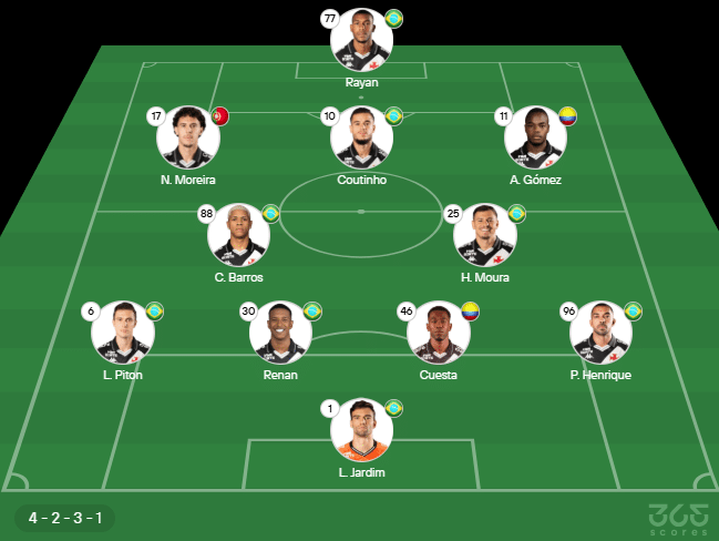 - Provável escalação do Vasco: Léo Jardim; Paulo Henrique, Cuesta, Robert Renan e Lucas Piton; Hugo Moura e Cauan Barros; Andrés Gómez, Coutinho e Nuno Moreira; Rayan