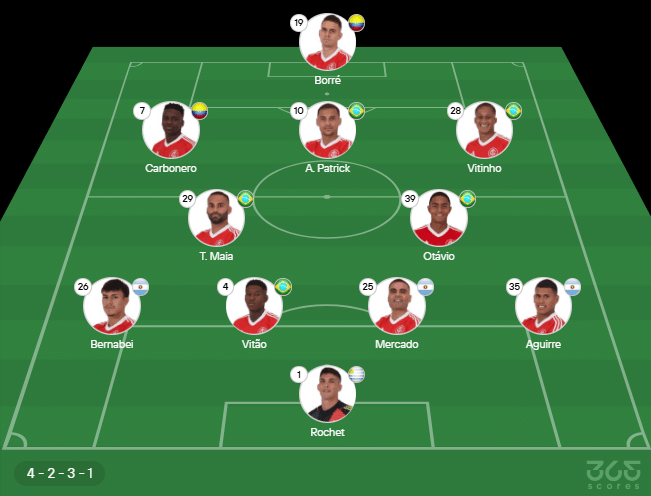 - Provável escalação do Internacional: Rochet; Aguirre, Mercado, Vitão e Bernabei; Otávio e Thiago Maia; Vitinho, Alan Patrick e Carbonero; Borré