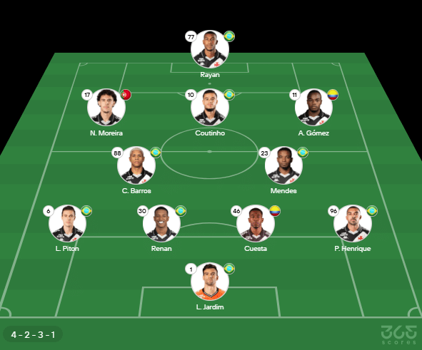 - Provável escalação do Vasco: Léo Jardim; P.Henrique, Cuesta, Renan, L. Piton; Mendes, C. Barros, Coutinho; A. Gómez, Nuno Moreira, Rayan