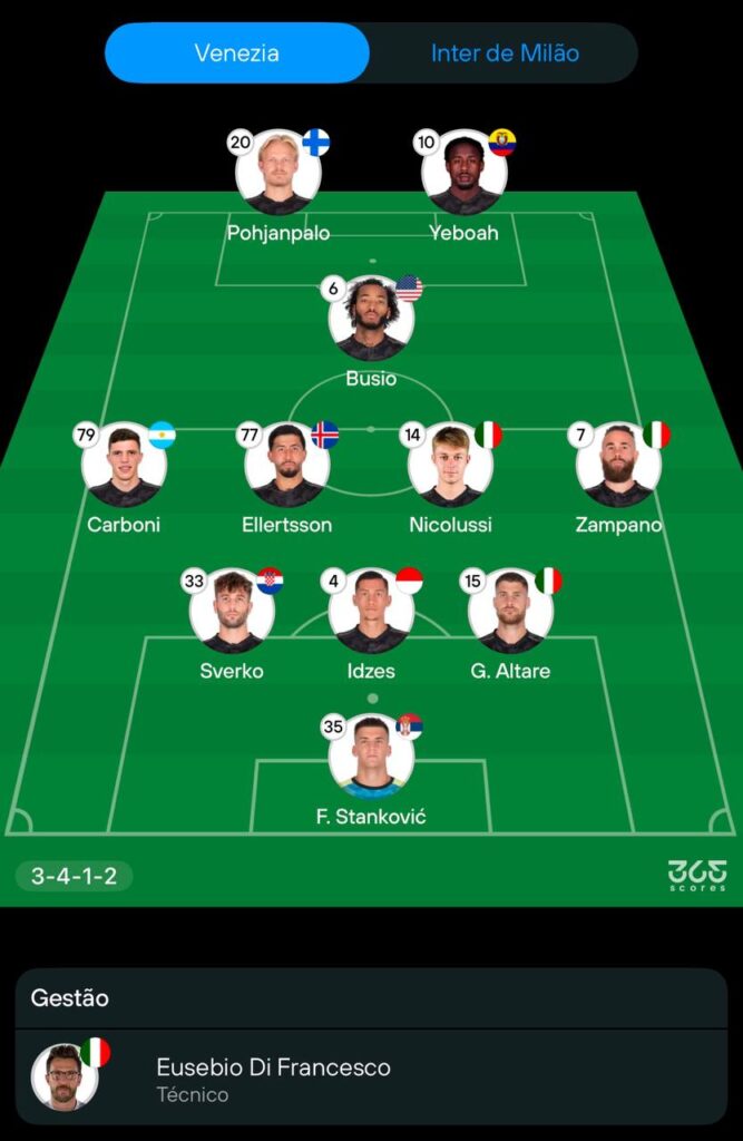 - Provável escalação do Venezia: Stankovic; Altare, Idzes e Sverko; Zampano, Nicolussi, Ellertsoon, Carboni e Busio; Yeboah e Pohjanpalo.