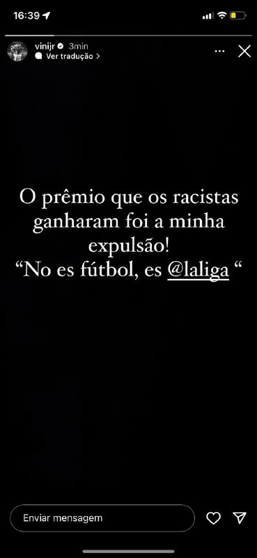 “O prêmio que os racistas ganharam foi a minha expulsão! Não é futebol, é LaLiga”, disse o jogador do Real Madrid.