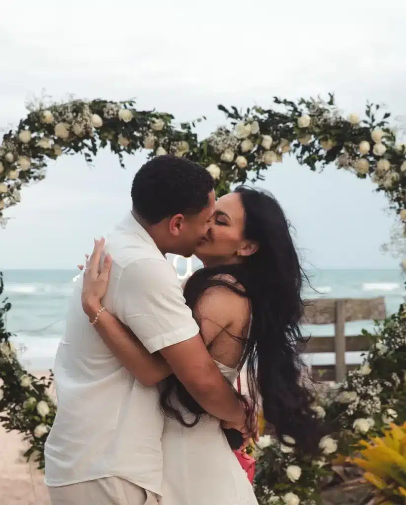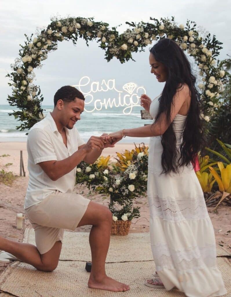 O atacante Vitor Roque, do Athletico, se casou neste fim de semana com a estudante Dayana Lins. O jogador divulgou registros da cerimônia, que aconteceu na península de Maraú, na Bahia, em seu Instagram.