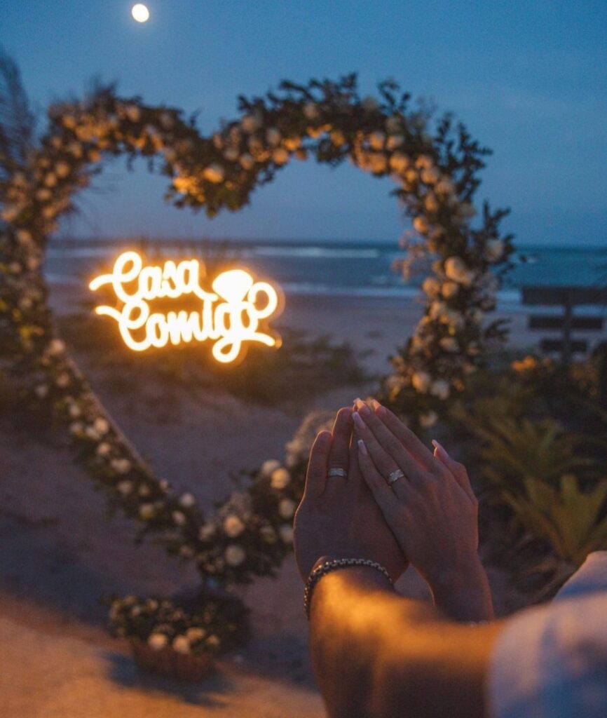 Nas imagens, Vitor aparece ajoelhado e colocando um anel em sua noiva, depois, o jogador registrou sua mão e de sua esposa com as alianças já colocadas.