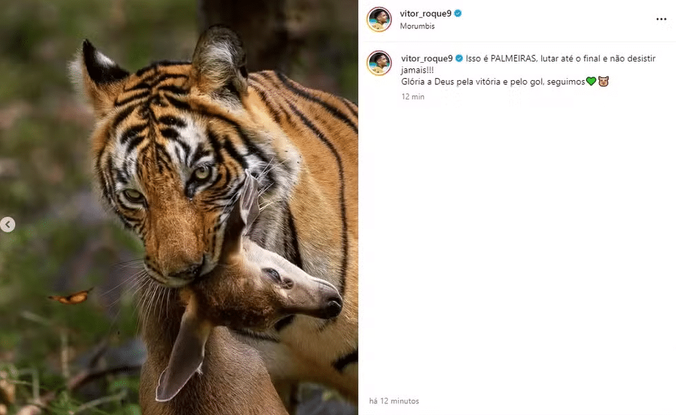 Ainda em sua fala, Vitor Roque indicou que a postagem não teve tom de ofender ninguém, mas sim aconteceu em tom de brincadeira. A imagem era de um tigre (seu apelido) mordendo o pescoço de um veado.