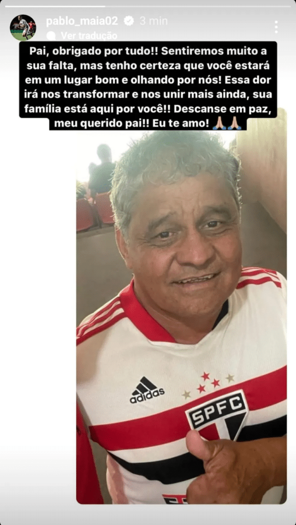 O volante Pablo Maia, do São Paulo, anunciou em suas redes sociais o falecimento do seu pai, que lutava contra um câncer. O jogador foi liberado do treino desta manhã e deve ser ausência na partida de volta contra o Palmeiras, pelas quartas de final da Copa do Brasil, nesta quinta-feira (13).