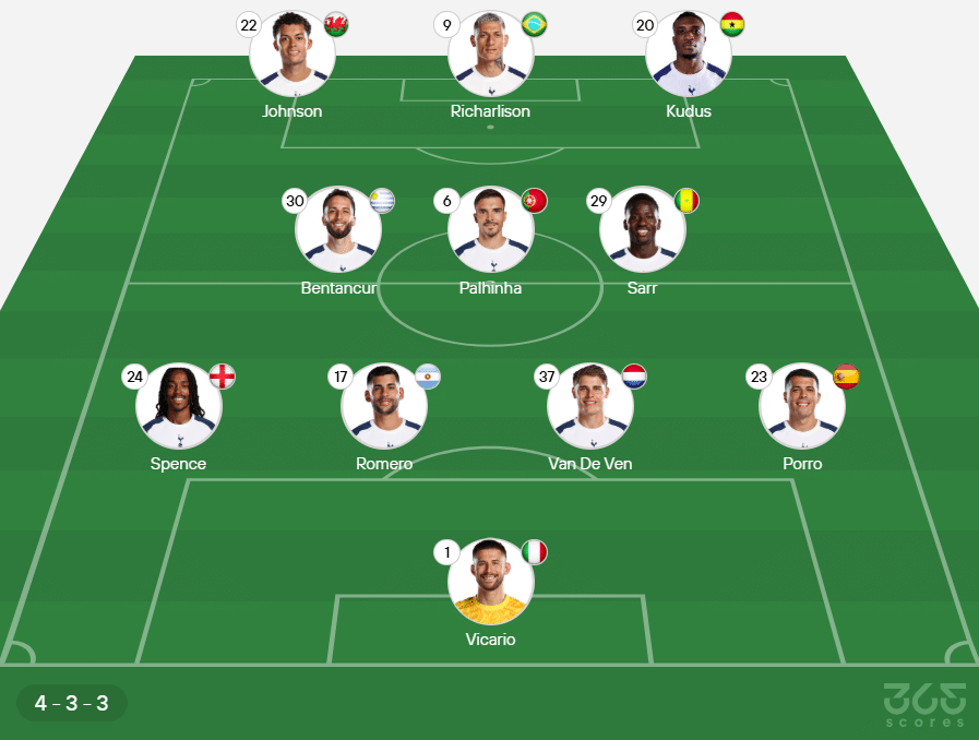 Provável escalação do Tottenham: Vicario; Pedro Porro, Van de Ven, Romero e Djed Spence; Palhinha, Bentancour e Pape Sarr; Kudus, Brennan Johnson e Richarlison.