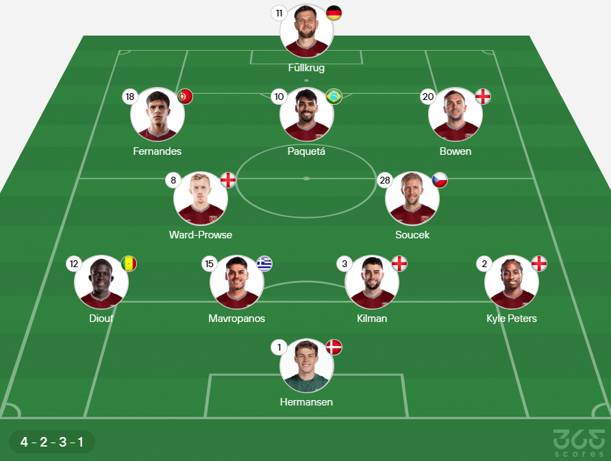 Provável escalação do West Ham: Hermanses; Kyle Peters, Kilman e Mavropanos e Diouf; Soucek e Ward-Prowse; Lucas Paquetá, Bowen e Mateus Fernandes; Füllkrug.