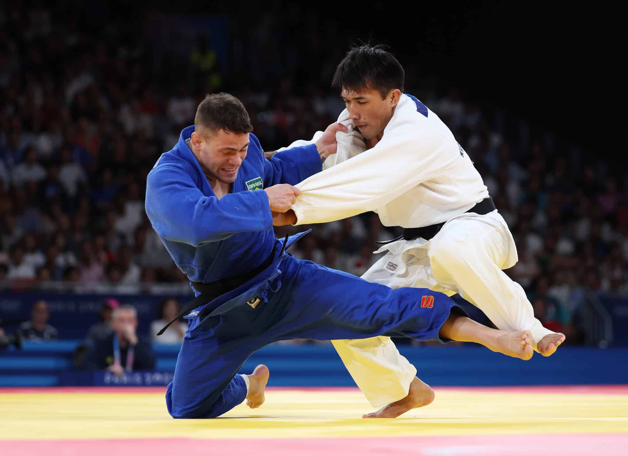 Desde o início, o brasileiro foi agressivo. Ele buscou as primeiras entradas de queda, enquanto Kyrgyzbayev era cauteloso e focava em se defender. Tanto foi assim que o judoca cazaque levou dois shidos em menos de 1 minuto e meio.