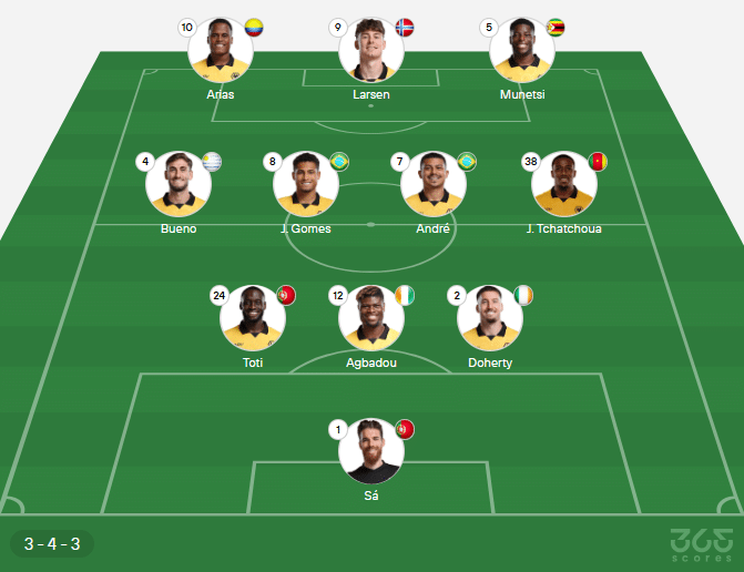 Provável escalação do Wolverhampton: Sá; Doherty, Agbadou, Toti; Tchatchoua, André, João Gomes, Bueno; Munetsi, Arias, Larsen. Técnico: Vitor Pereira