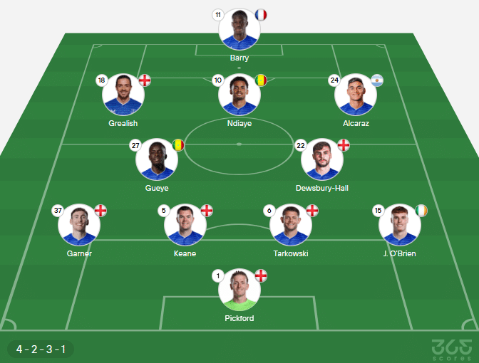 Provável escalação do Everton: Pickford, O’Brien, Tarkowski, Keane, Garner; Bewsbury-Hall, Gueye, Alcaraz, Grealish, Ndiate; Barry. Técnico: David Moyes